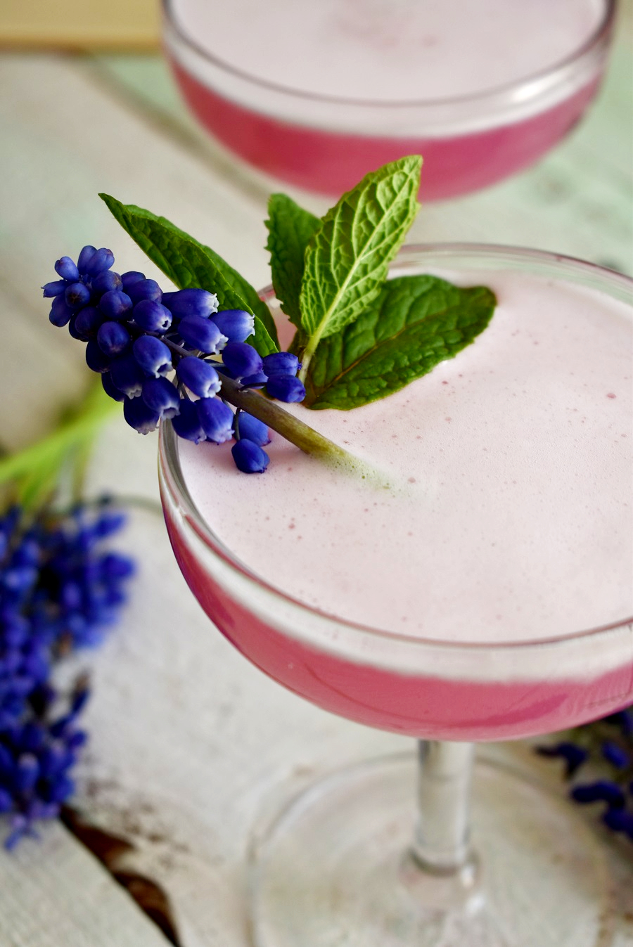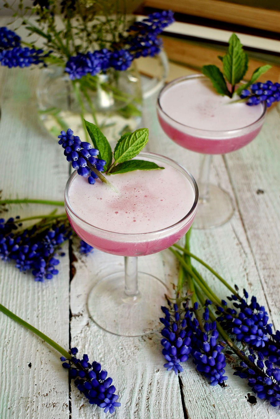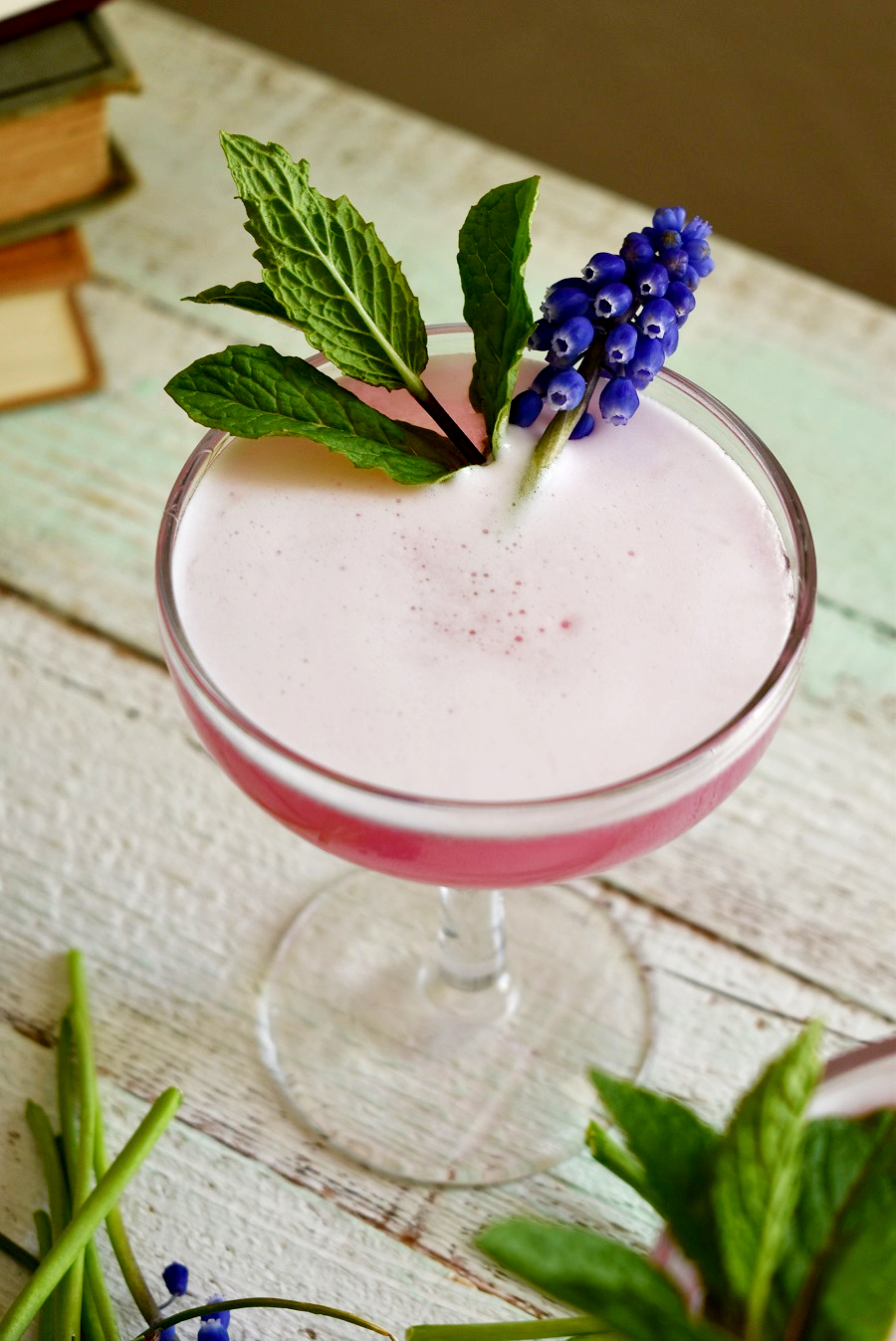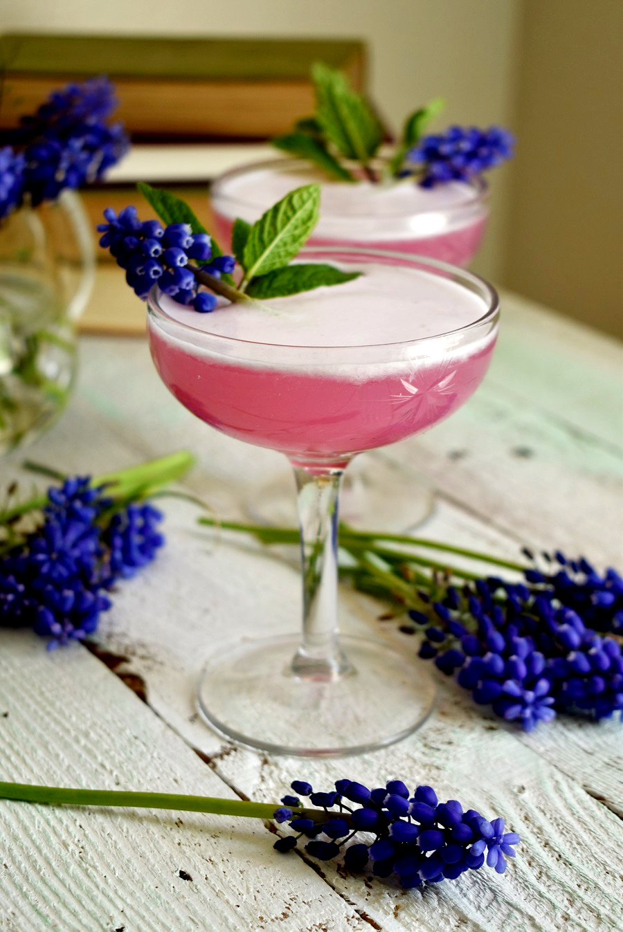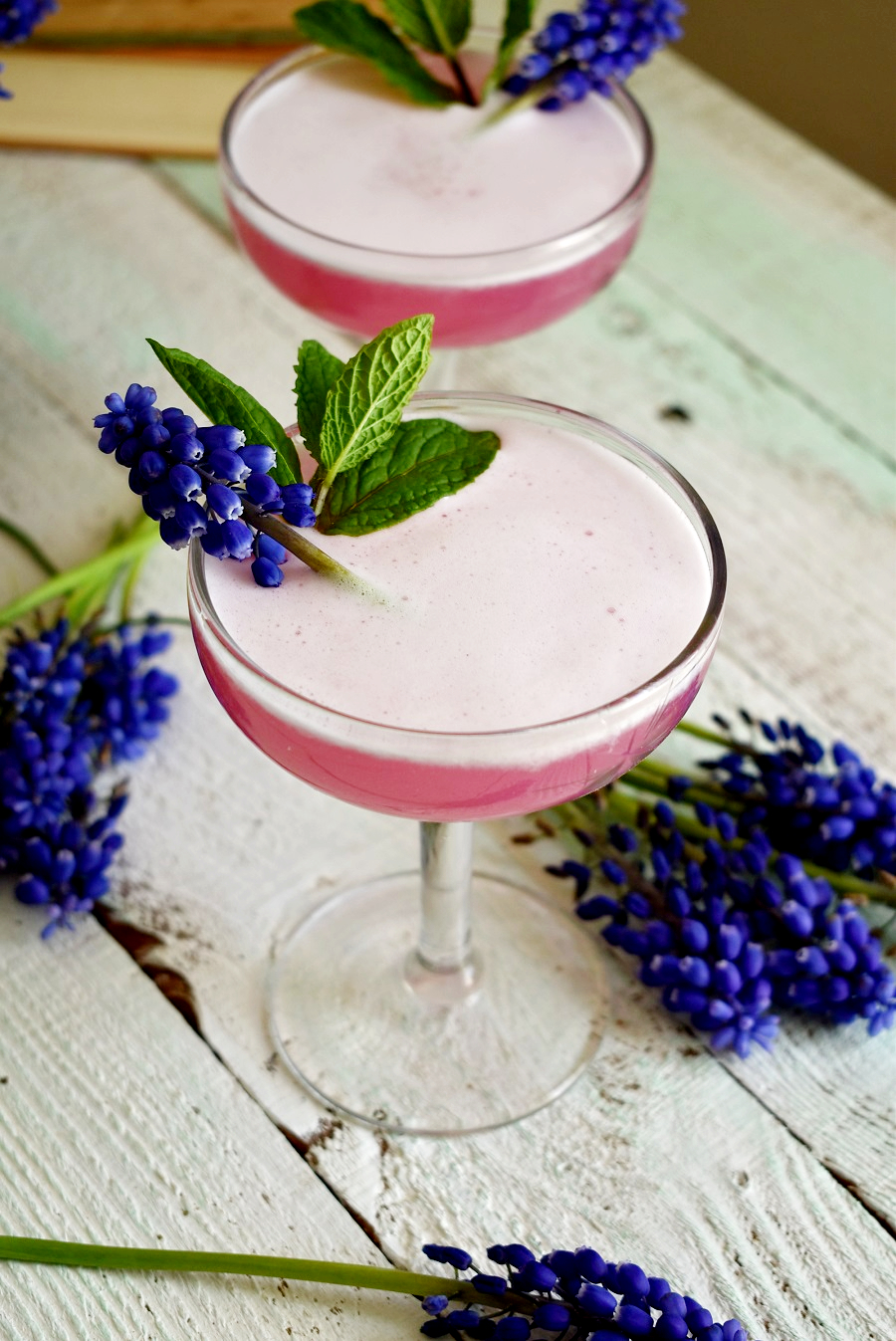 After seeing several people share recipes for Grape Hyacinth Lemonade on TikTok last year, I knew I had to create my own concoction with these. I started with a batch of homemade Grape Hyacinth simple syrup, which was surprisingly easy to make. I paired a little of that with gin, Elderflower liqueur, lime juice, and egg white to put my own spring spin on a classic Gin Fizz. The end result is a lightly sweet, floral cocktail with a beautiful purple-pink hue and a frothy top. Since the flower has high amounts of anthocyanin (the pigment in the flowers) when you add lime or lemon juice it turns it pink. Science lesson and you get a buzz? That’s a win-win!