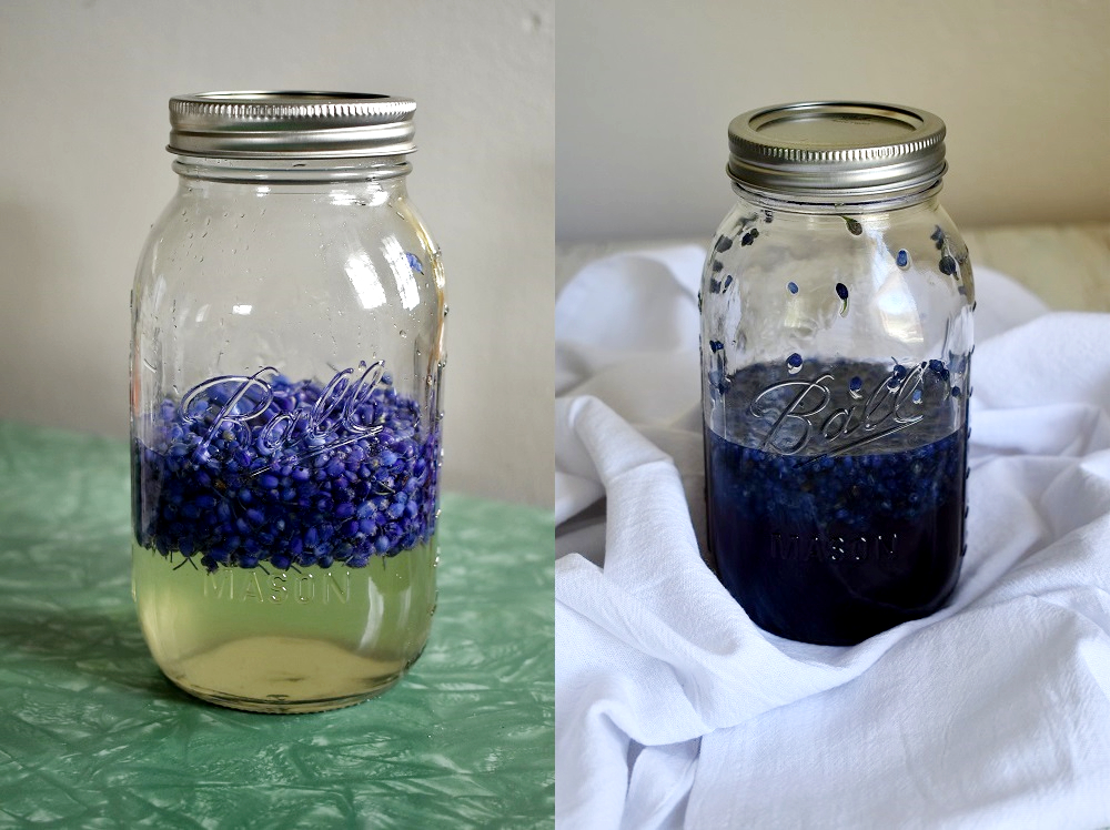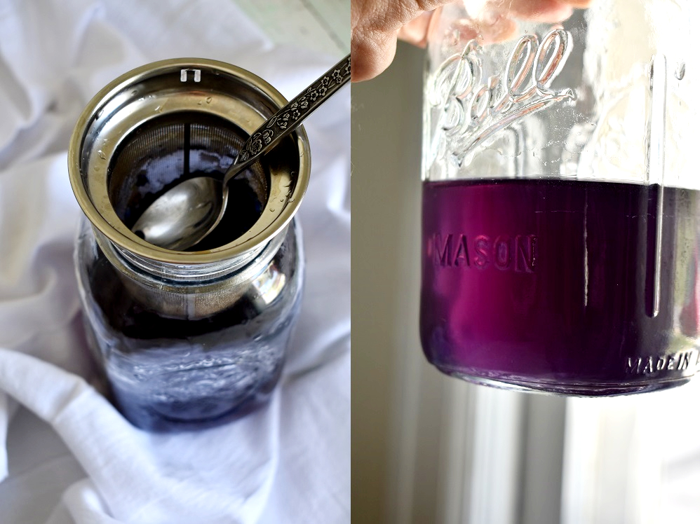 Place your flower buds in a large canning jar, followed by the cup of sugar. Heat the cup of water in a tea kettle or small saucepan until it’s boiling. Pour over the sugar and flower buds. Seal with a lid, wrap in a dish towel (so you don’t burn your hands), and shake until the sugar is completely dissolved. I let mine completely cool on the counter overnight to get the richest purple coloring that I could (and also because I had about 30 other projects going on), but it should be good after 3 or 4 hours. Strain into a new jar, seal, and store in the fridge until ready to use.