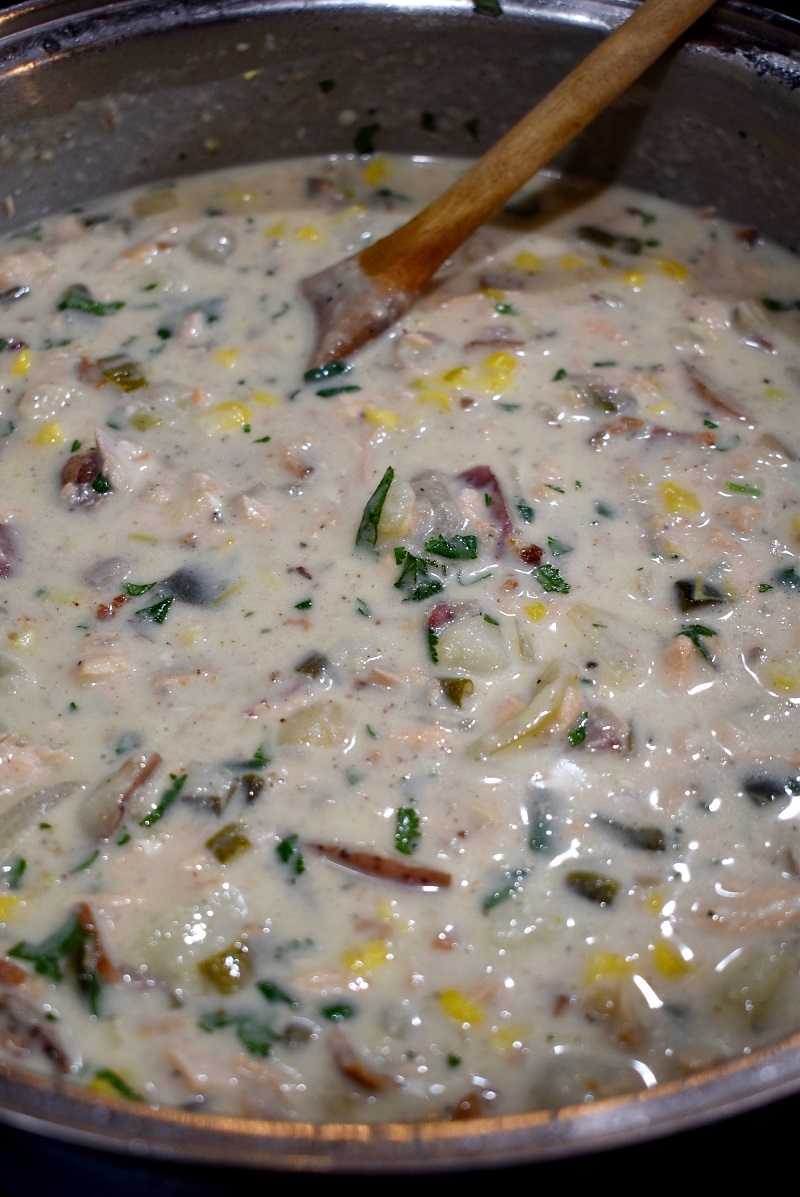 Using a fork, shred your cooked salmon into bite sized pieces and add to the chowder. Give it a stir, taste test, add more salt or a little lime juice, and then dish it up!